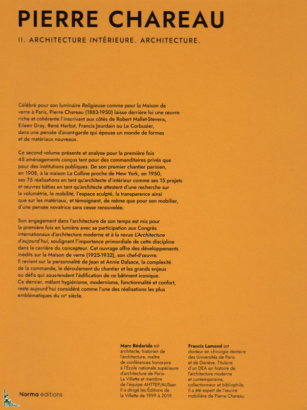 Pierre Chareau 2, Architecture intérieure, architecture, de M. Bédarida et F. Lamond, Ed. Norma, 23 cm x 31 cm, reliéavec 368 pages