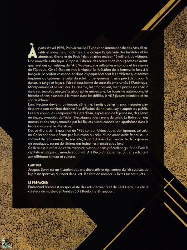 Starting in April 1925, Paris hosted the International Exhibition of Modern Decorative and Industrial Arts. It occupied the Esplanade des Invalides and the areas surrounding the Grand and Petit Palais, attracting around 16 million visitors. A new aesthetic was emerging. Freed from pre-war bourgeois conventions and the convulsions of Art Nouveau, it reflected the ambitions and hopes of the time. Speed, women's liberation, French luxury, cosmopolitan comfort, emblematic of which ocean liners are the emblems, forms inspired by cubism, the cult of the sun, an unprecedented craze for dance, tango and jazz, alcohol in the form of cocktails borrowed from America, Montparnasse and its artists are celebrated in bulk. Cinema, soon talking, brings universal geography within everyone's reach in its dark temples. Automobile tourism, and soon air tourism, is associated with fashion in parades, seaside resorts and winter sports. Architecture becomes luminous, airy, while department stores play a decisive role in spreading the new style to the public. Applied arts seize upon water jets, an expression of youth, zigzag lines, symbols of electric lightning and the sun's rays. The liberation of morals and bodies initiated by the Ballets Russes reached its apotheosis in haute couture and literature. The pavilions of the 1925 Exposition are emblematic of the era, such as the Collector's Pavilion, decorated by Ruhlmann, or that of a French embassy, a pinnacle of refinement. For its part, the Pont Alexandre III houses two shopping galleries, both showcases of the French luxury industries. This book reflects this unprecedented artistic adventure that made Paris the artistic capital of the world and saw Art Deco impose itself everywhere by adapting to different climates and cultures.