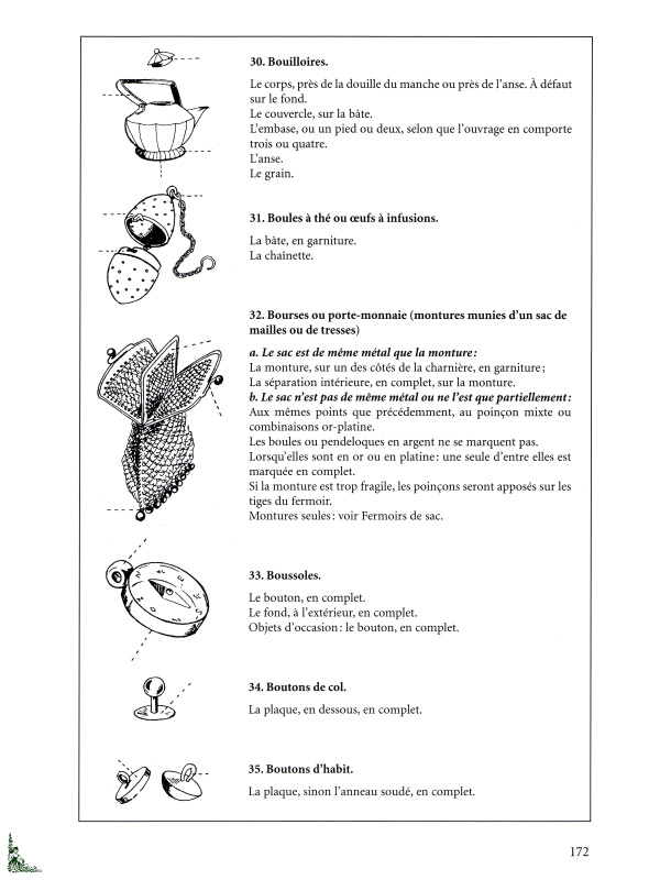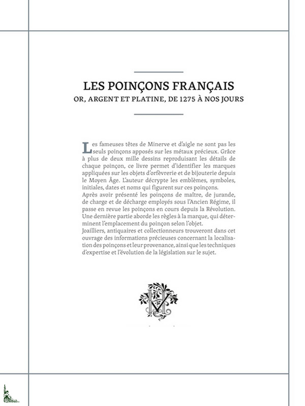 After presenting the hallmarks, jurande, charge and discharge marks used under the Ancien Régime, he reviews the hallmarks in use since the Revolution. A final section addresses the marking rules, which determine the placement of the hallmark depending on the object.